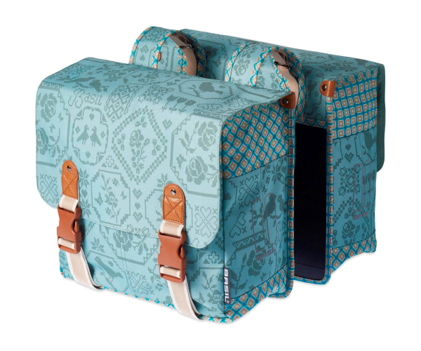 Basil Boh?me-Double Bag. Dubbele fietstas, gemaakt van waterafstotend polyester, binnenvoering, kunstleren details, afsluitbaar d.m.v. aansnoerkoord, twee banden t.b.v. LED/snelbinders/kinderzitje/veerklem, dubbele reflectie zijkanten, inhoud: 35L, Jade.